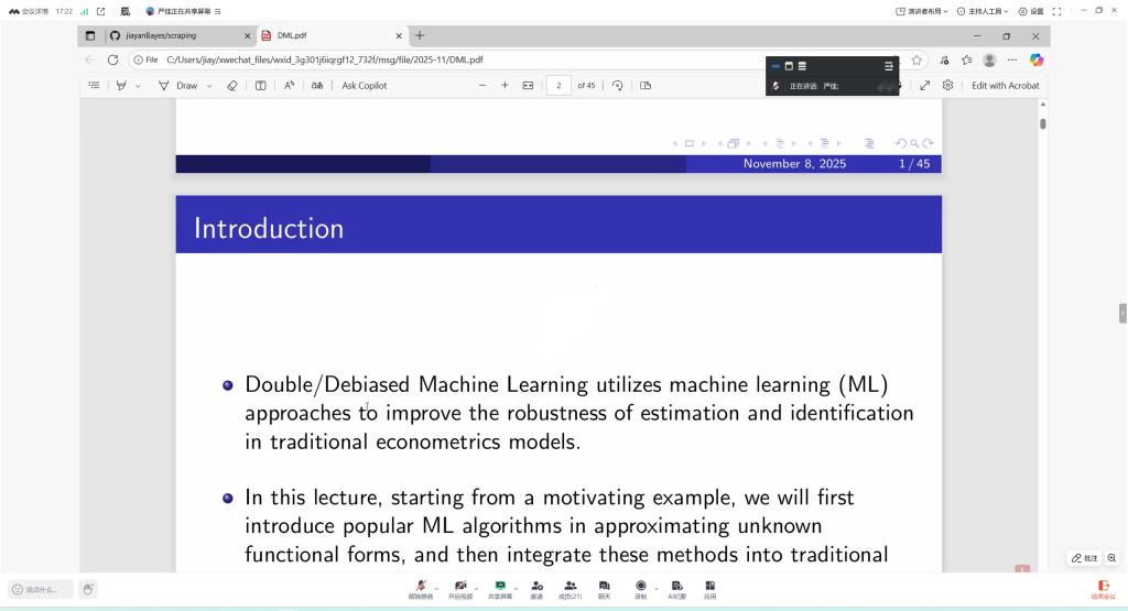 严佳教授在讲座中分享如何利用双/去偏机器学习(ML)方法来提高传统计量经济学模型中估计和识别的稳健性。他首先介绍在近似未知函数形式中流行的机器学习算法,然后介绍如何将这些方法整合到传统的计量经济学模型中。